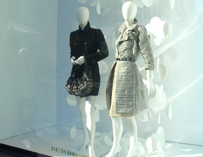 Fabricación de elementos decoracion para escaparate de Burberry, en Barcelona. El trabajo de escaparatismo se hizo en poliester troquelado en círculos, materiales que dejaron un acabado impecable en el escaparate, para que el producto luciera a plenitud.